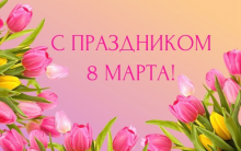 Дорогие и прекрасные женщины! Поздравляем Вас с Международным Женским Днем! Желаем вам как можно больше счастливых событий в жизни, красоты, оптимизма, любви, праздничного настроения, а самое главное - здоровья вам и вашим близким! Пусть в доме всегда будут уют, благополучие и достаток! Пусть близкие люди говорят вам теплые слова, окружают любовью и нежностью, пусть в душе будет весна!